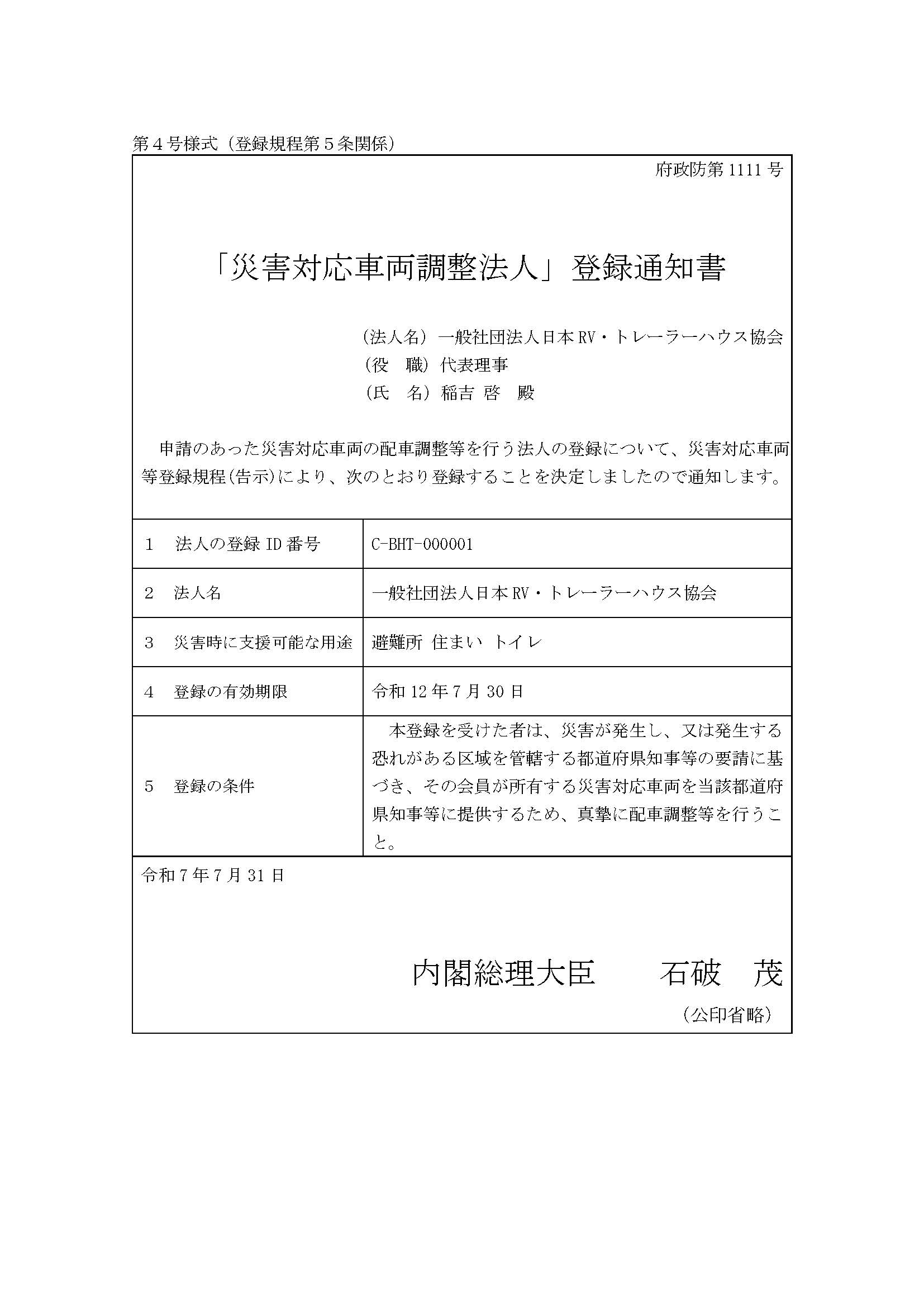 「災害対応車両調整法人」登録通知のお知らせ2025.07.31