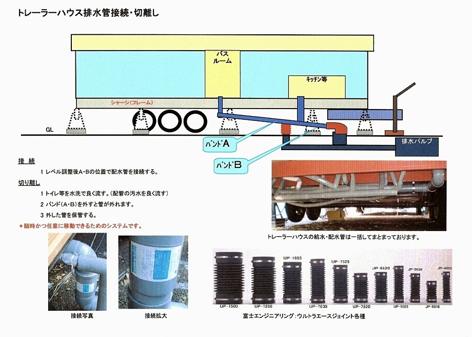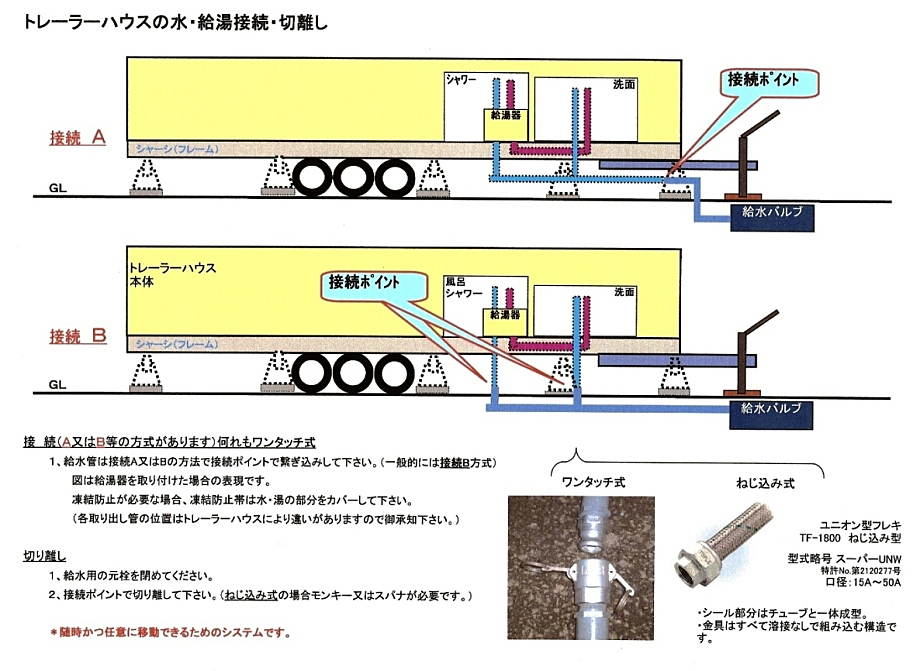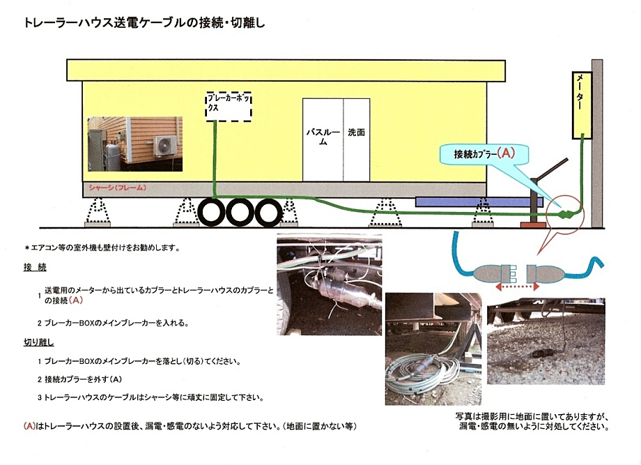 トレーラーハウス設置・ライフラインの接続(切り離し)等をわかり易く図解で説明しております。