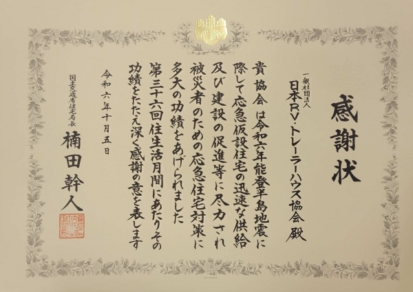 当協会は、令和6年能登半島地震の被災地において応急仮設住宅を建築した功労として、国土交通省住宅局長より感謝状が授与されました。
